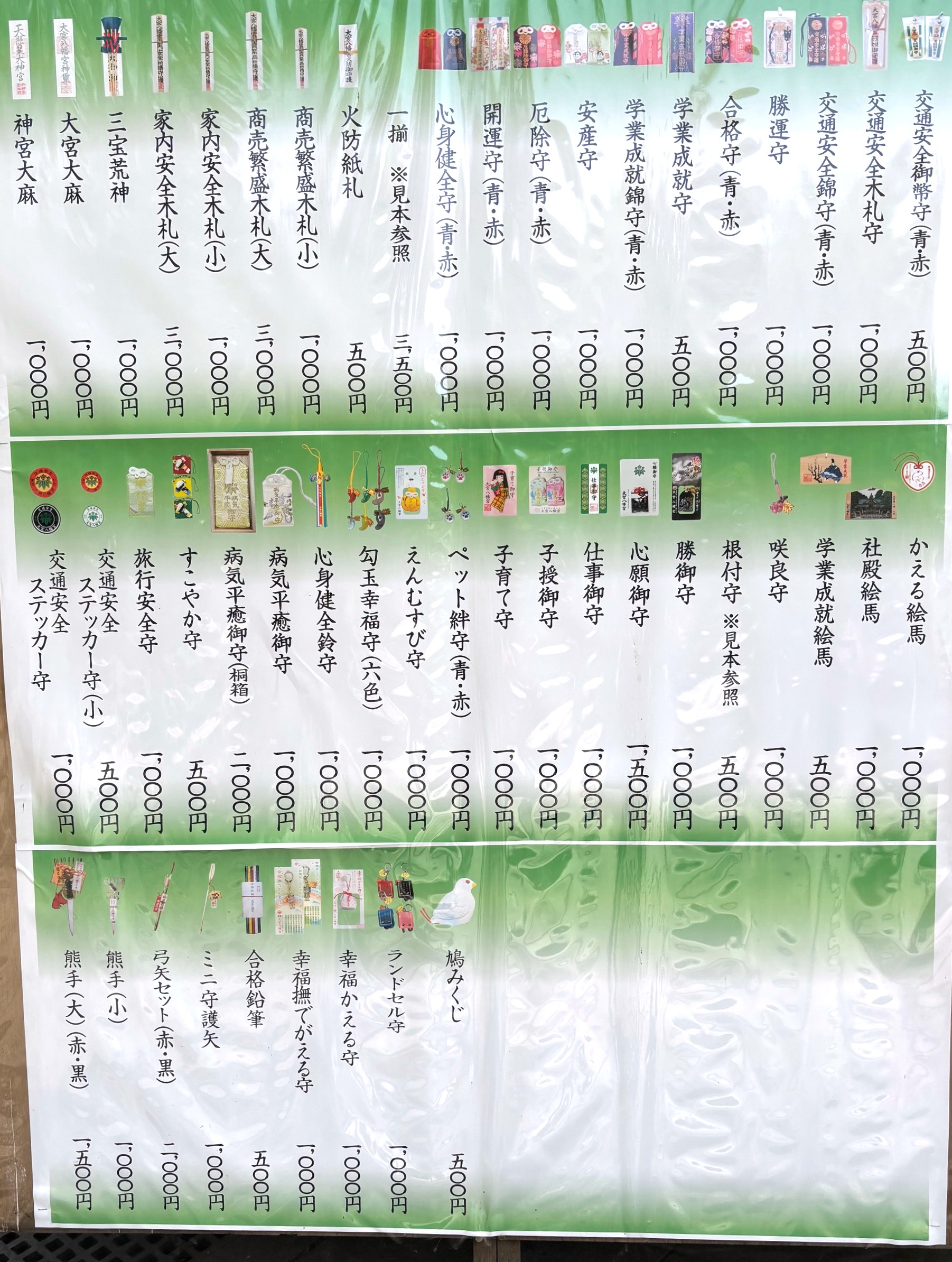 今回、散策、お参りしていて、神社で手に入れることができるお守り類の多さに驚いた。個々に値札が付いている。