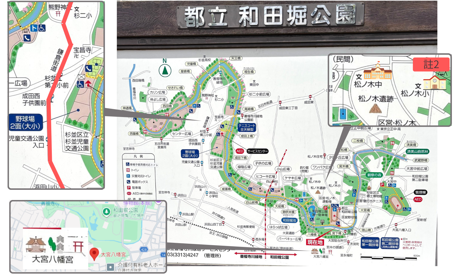 和田堀公園には、テニスコートや野球場 「ヒコーキ広場」「ケヤキ広場」「ワンパク広場」や、郷土博物館も揃っていて都民の憩いの場となっている。ここ杉並区にも鎌倉街道が通っているのを“発見”すると、先月号のブログを思い出し、ちと、嬉しくなった。(註3)